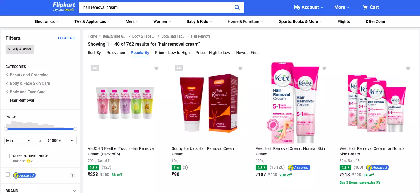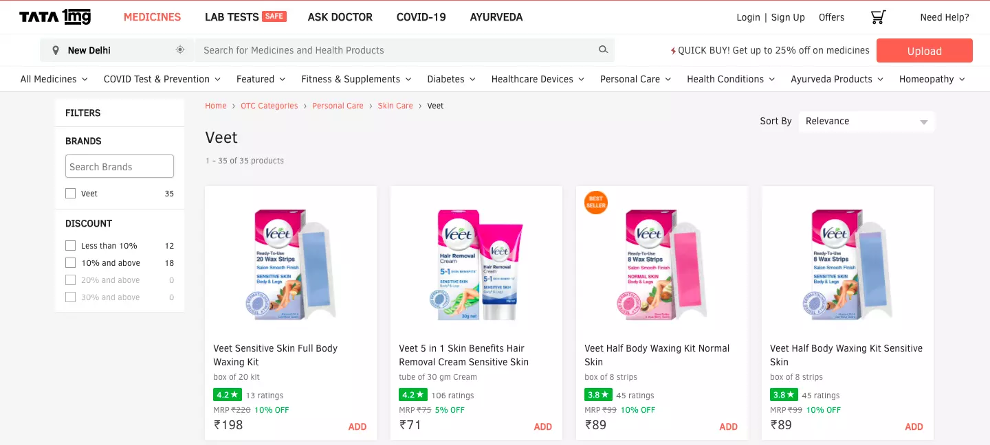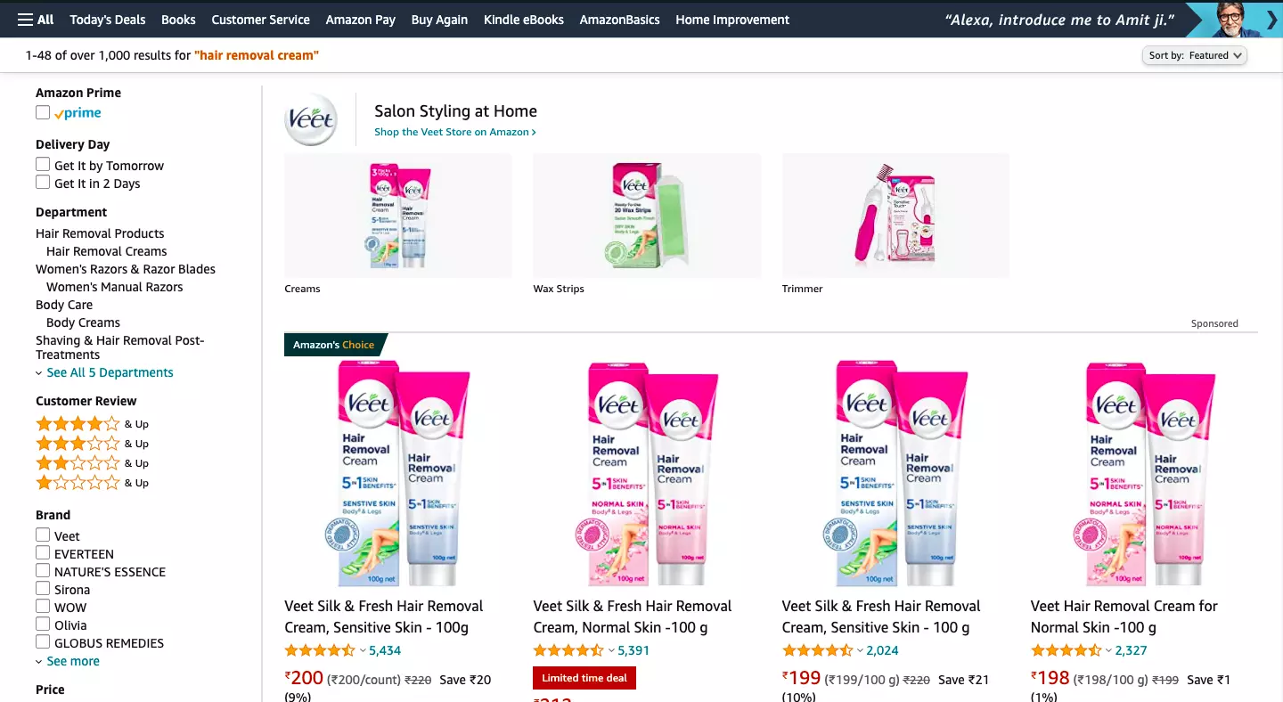 Surprisingly Veet is not available/ out of stock on Purplle.