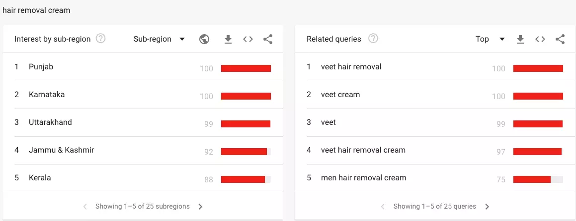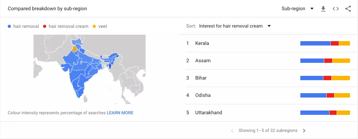 Comparing the keyword for Brand - Veet and analysing based on region of searches.