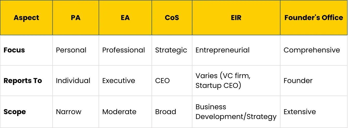 Let’s break down the key differences between a Personal Assistant (PA), Executive Assistant (EA), Chief of Staff (CoS), and Founder’s Office: